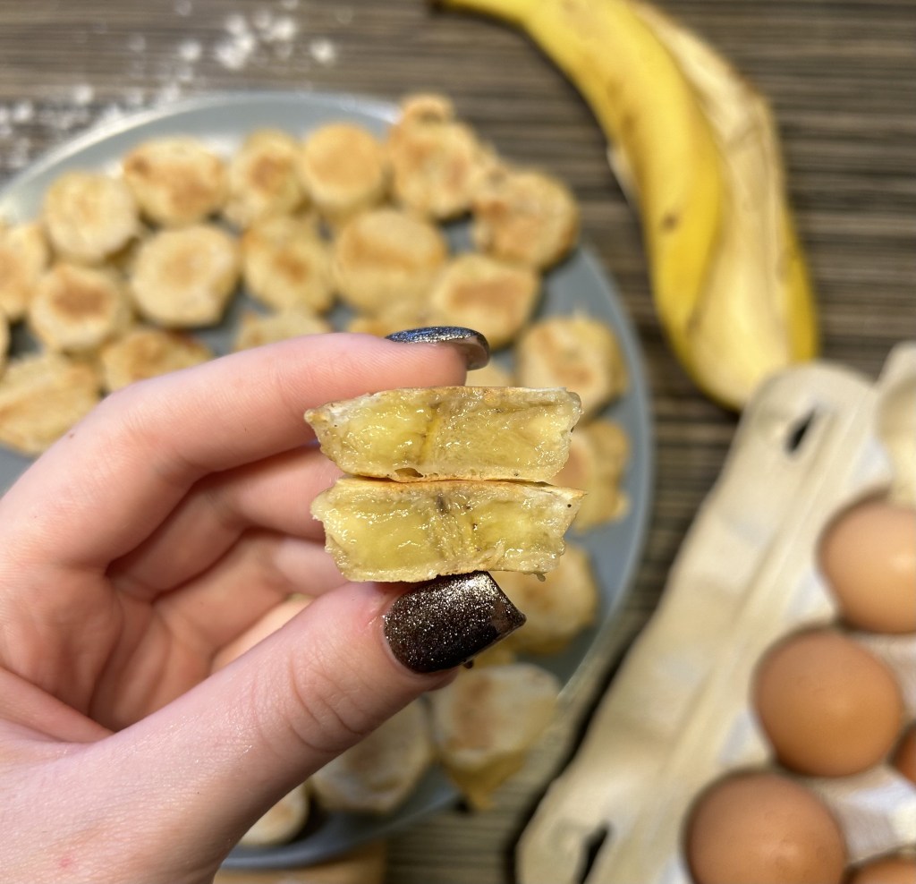 Ezután felkarikázzuk a banánt és egyesével beleforgatjuk a palacsinta tésztába.